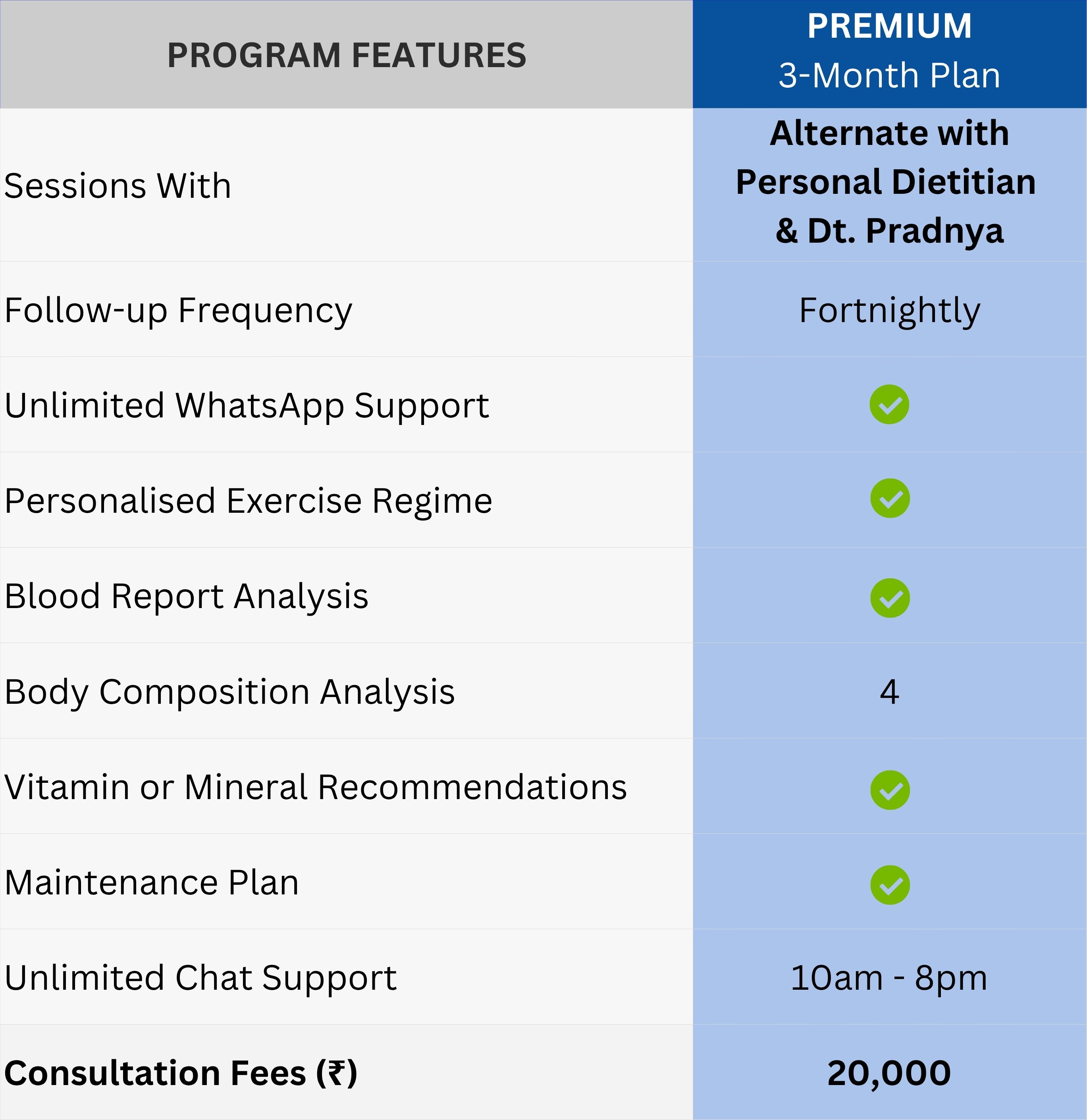- Alternate sessions with Personal Dietitian & Dt. Pradnya